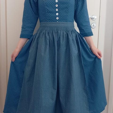 Helmi Vuorelma käsinkudottu esiliina (Lahti) Ikäisekseen hyvä kunto, mutta yhdestä kohtaa kangas ohentunut n. 5 mm aluella, siitä kuva mitan kanssa. Näkyy lähinnä vain valoa vasten.