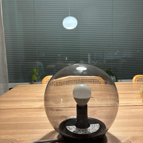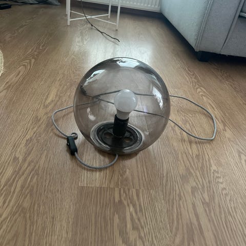 Ikea Fado pöytävalaisin, jossa pallo lasivarjostin. Valaisimessa on valkoinen johto ja kytkin. Valaisin edustaa modernia tyyliä, joka sopii monenlaisiin sisustuksiin. Ikea on tunnettu ruotsalainen huonekalujen ja sisustustuotteiden valmistaja.