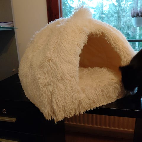 Lemmikin peti 55x45x21, uutta vastaava. Ehti vähän aikaa olla kissalla käytössä. Oli vielä viltti tuossa lisäksi, joten ei tullut jälkiä.