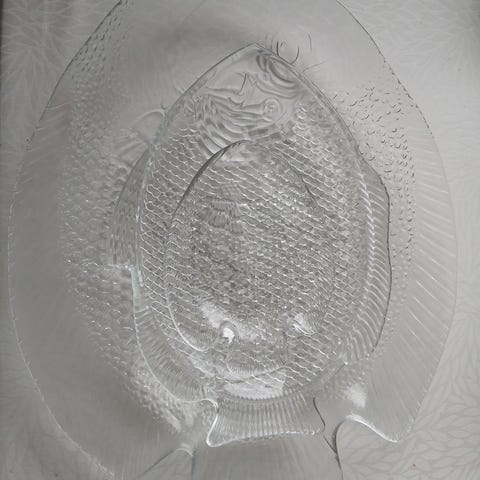 Kala tarjoiluvati kirkasta lasia. Vadin muoto ja pintakuviointi esittävät kalaa, ja pinnassa on kohokuvioitu suomukuvio. Materiaalina on läpinäkyvä lasi. Soveltuu esimerkiksi tarjoiluun ja kattaukseen.