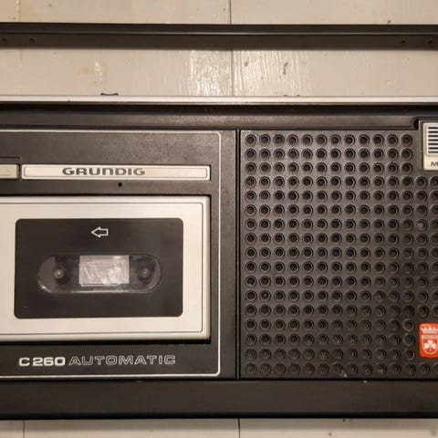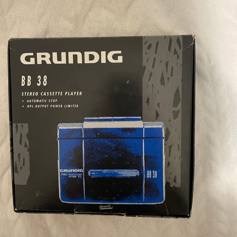 Grundig CR 100 kasettinauhuri. Laitteessa on yläkautta avautuva kasettilokero sekä sisäänrakennettu kaiutin. Etupaneelissa on mekaaniset toisto-, pysäytys-, kelaus- ja äänityspainikkeet. Virtajohto kuuluu laitteeseen kiinteästi. Sopii esimerkiksi ääninauhojen kuunteluun ja äänittämiseen kasetille, kuten puhe- tai äänidokumenttikäyttöön.Verkkovirta tai paristotoiminto. Koekäytetty. Toimii.