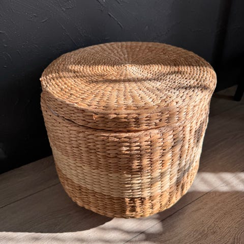 Rahi, rottinkia. Halkaisija 68 cm. Korkeus 40 cm. Yksi murtuma (kuva). Pysyy kiinni esim teipillä.