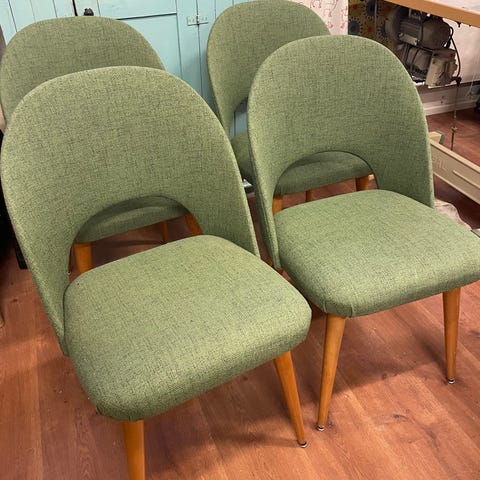 Siistikuntoiset, kertaalleen entisöidyt ruokapöydän tuolit 60-luvulta. Osassa liitokset kaipailevat liimojen uusimista jotta tukevoituvat