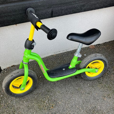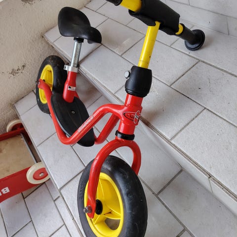Puky potkupyörä lapsille. Rungon väri on musta, ja pyörässä on punaisia yksityiskohtia. Varustettu ilmakumirenkailla, satula on säädettävissä. Sopii tasapainon harjoitteluun ja liikkumiseen pihalla tai kävelyteillä.