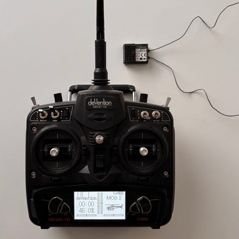 Tuollainen devo 7 ylimääräisenä ja mukaan tulee myös tuo walkera rodeo 150 yhdellä akulla ja toimii juurikin tolla radiolla, akku ei kauaa kestä ja akkukotelon kansi on mallia oma tekele mutta pysyy paikallaan jos ei kovaa tömähdä maahan.