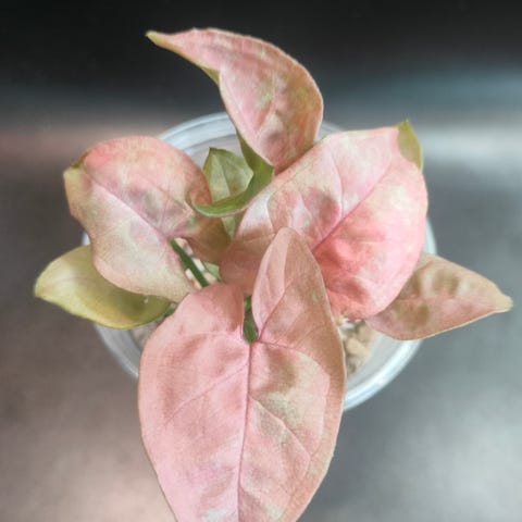 Pieni perliitissä hyvin kasvava syngonium Pink on Pink latvapistokas. Hyötyy punaisesta valosta, jotta kaikki sävyt erottuvat kauniisti.