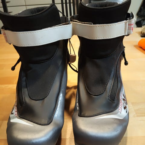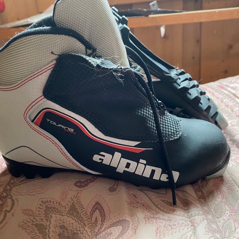 Alpina Touring hiihtomonot. Väri musta–valkoinen, edessä nauhat ja vetoketjullinen läppä.