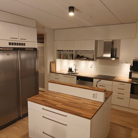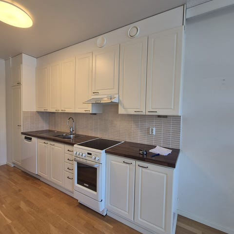 Keittiökaapistot, joissa valkoiset ovet ja laatikostot sekä puunväriset reunukset ja sokkelit. Ylä- ja alakaapit, kulmakaappi, laatikostot sekä työtasot. Sopii keittiöön kokonaisena kaapistokokonaisuutena tai osiin jaettuna esimerkiksi säilytysratkaisuihin kodinhoitohuoneeseen tai varastoon.
