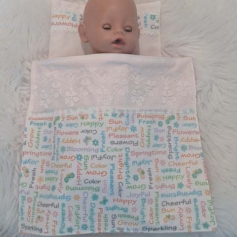 Baby Born kokoiselle nukelle peittosetti vanharoosan kultahipuin värisestä double gauze kankaasta. Molemmissa ohut vanu välissä. Pieni rusettipanta tulee mukaan. Peiton korkeus n.45cm leveys n.34cm, tyyny korkeus n.12cm leveys n.16cm. Kuvassa oleva nukke ja sänky ovat mallina.