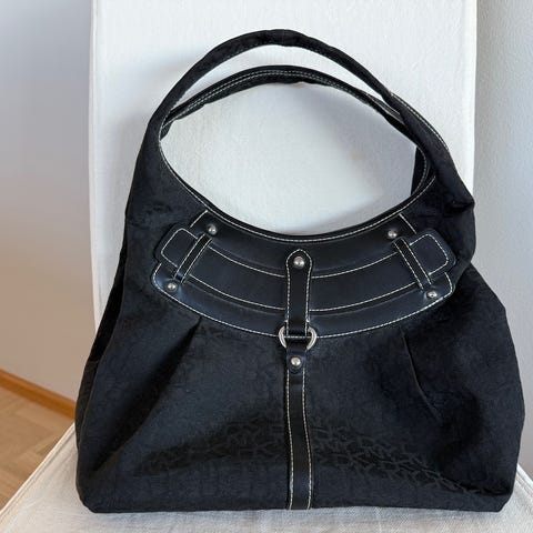 Myydään hyväkuntoinen musta keinonahkainen käsilaukku. Metallinen vetoketju, sisällä pieni sivutasku. Hihnan pituus on 48cm. Laukun leveys on noin 30cm ja korkeus on noin 27cm. Nouto tai ostajalle toimituskulut.