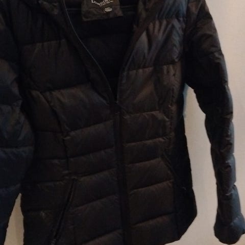 Lämmin talvitakki, josta saa myös toppaliivin. Vyötäröllä kiristys. Kai-kai n 56 cm ja kai-helma n 46 cm. Ei huppua, mutta on korkea ja paksu kaulus. Koko on 34, mustaa vastaa kokoa s.
