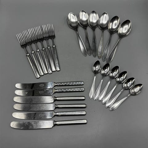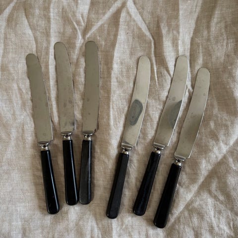 Alkuperäisissä laatikoissaan olevat wanhat, hyväkuntoiset Sorsakosken aterimet, vähällä käytöllä olleet. Yksi veitsistä englantilainen, joka erottuu muista teräosan ja kahvan välisestä osasta mustana (näkyy toisessa kuvassa).