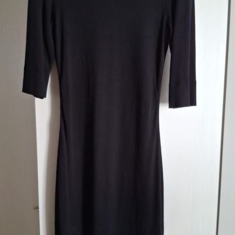 Marc O’Polo naisten mekko, koko 38. Musta pohjaväri, jossa vaalea pilkkukuosi. Materiaalina polyesteri. Mekossa on pitkät hihat ja pyöreä pääntie, takana nappikiinnitys pääntiellä.