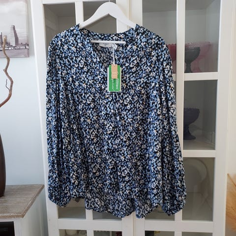 Next paita naisille, koko 44. Paidassa on kirjava etuosa, jossa pieniä monivärisiä kuvioita tummalla pohjalla, sekä yksivärinen tumma takaosa ja toinen hiha. Materiaali on 96 % polyesteriä ja 4 % elastaania, mikä tekee kankaasta joustavan ja kevyen. Lyhythihainen malli, pyöreä pääntie. Soveltuu arki- ja vapaa-ajan käyttöön.