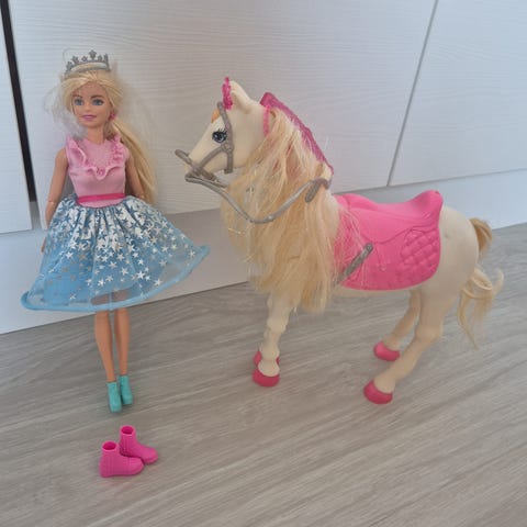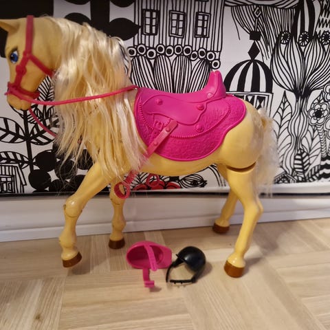 Barbie hevonen lelu, vaaleanruskea runko ja vaalea harja sekä häntä. Hevosella on vaaleanpunainen satula ja ohjat. Sopii Barbie-nukkejen kanssa leikkimiseen ja hevosteemaisiin roolileikkeihin.