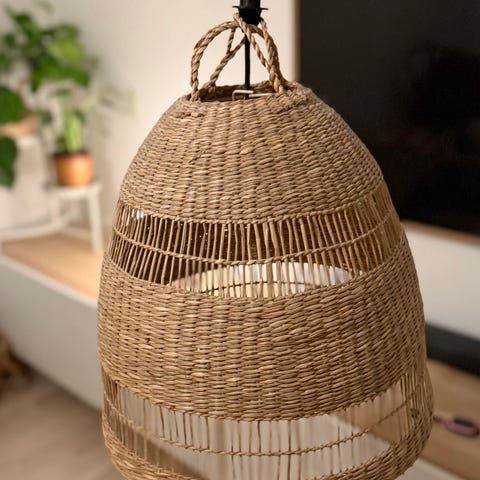 Korkeus 34 cm. Halkaisija 36 cm. Saraheinästä valmistettu. Kerran kokeiltu ja todettu väärän kokoiseksi. Ovh. Ikeassa 16,99 €. Ei postitusta.