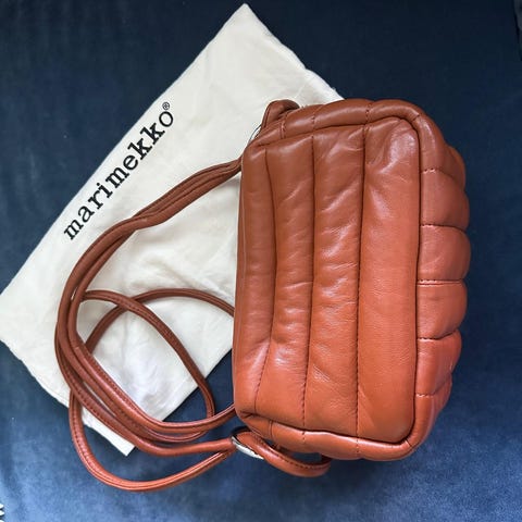 Marimekon hyväkuntoinen olkalaukku.Ruskeaa nahkaa. Hinta:95€ Voin myös postittaa,jolloin ostaja maksaa postikulut.