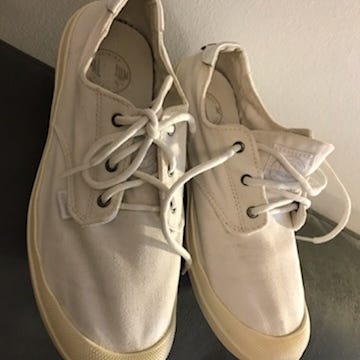 Valkoiset Palladiumin canvas-tennarit, koko 37, sisämitta 22 1/3 cm. Tummentumaa on kankaassa, mutta muutoin ehjät jokapuolelta. Pesemällä varmaan saisi väriä siistittyä.
