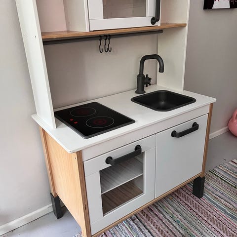 Paljon leikitty lasten leikkikeittiö.