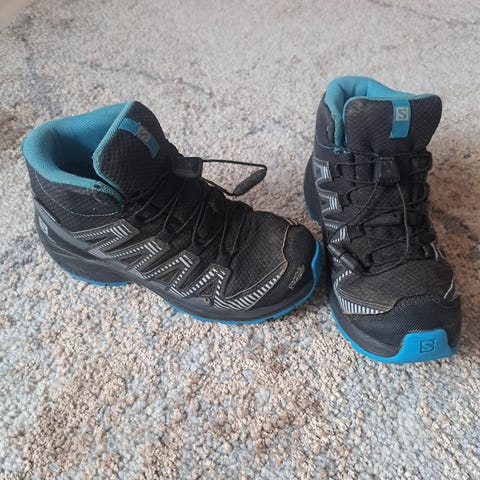 Salomon-merkkiset vedenpitävät välikausikengät koko 32. Kengissä on nauhat pikakiristyksellä ja karkea, pitävä pohja. Sopii myös vaellukseen.