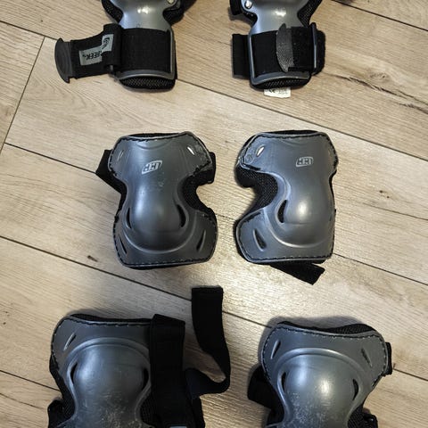 Kaksi settiä, koot S ja M. Molemmat setit sisältävät ranne-, kyynär- ja polvisuojat. Pintanaarmuja suojissa jonkinverran on, mutta muuten ehjät ja tarrojen pito hyvä. Hinta 10€/ setti, molemmat setit yhteensä 15€. Vain nouto.