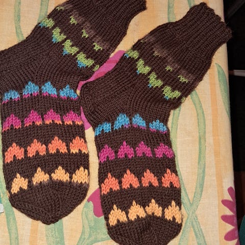 Uudet, käsin neulotut villasukat. Lanka on Kaupunki- sukkalankaa. Väri viininpunainen. Kuvissa näkyy suuntaa antavia mittoja. Kysy tarvittaessa lisätietoja. Koko 38-40. Sukissa on vahvistettu kantapää.