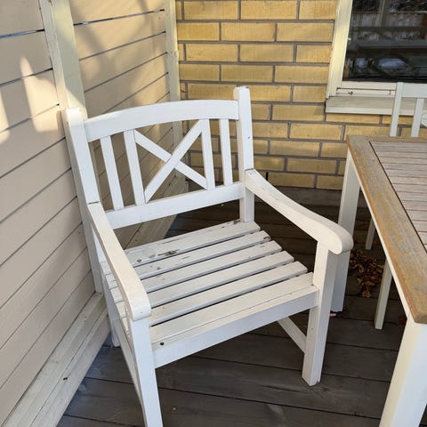 Parvekesetti puinen pöytä ja kaksi tuolia istuintyynyillä