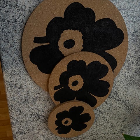Trikookuteesta käsin virkatut moniväriset patalaput. Näillä ei käsiä polta! Käyvät myös kattilan alustoiksi.