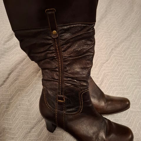 Pitkävartiset konstailemattomat nahkaiset saappaat (Remont) viileään säähän. Matala kanta, pukemista varten pitkä vetoketju sivussa ja säären takana koristeena vetoketju joka myös avattavissa. Hoidettu värittömällä nahkarasvalla, siitä luonnollinen ruskea nahan väri.