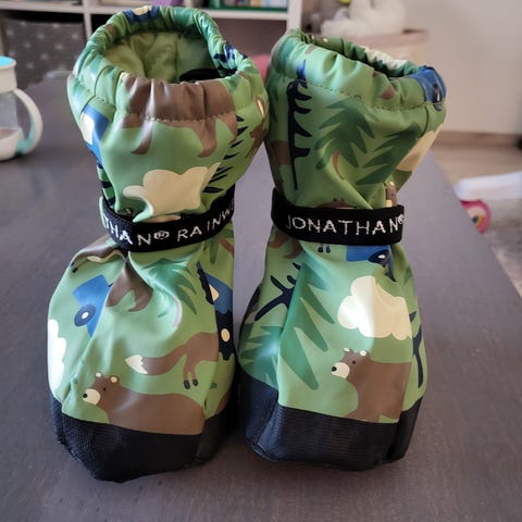 Kaksi paria sadetöppöset, meillä jääneet ihan muutamaan käyttökertaan kun lapsi oppi kävelemään. Toiden Jonathan merkkinen, koko 19/21 ja toinen koko 74cm.