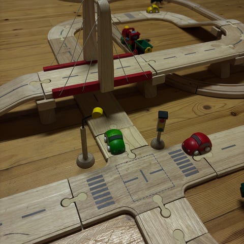 Toimiva ja hyväkuntoinen puinen parkkitalo, jossa junarata ja liikkuva hissi.