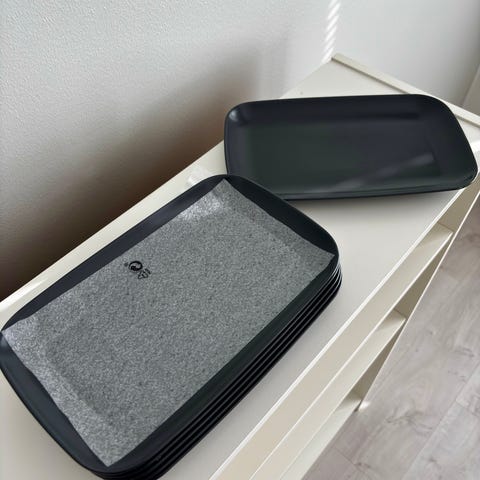 IKEA suorakulmaiset lautaset. Vaaleansävyiset, matalat tarjoilu- tai ruokailulautaset, pinottava malli. Sopivat esimerkiksi arki- ja kattauksessa käytettäviksi lautasiksi tai tarjottimiksi. Pientä käytön jälkeä näkyy (kts. kuva).