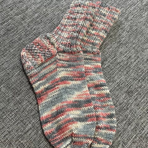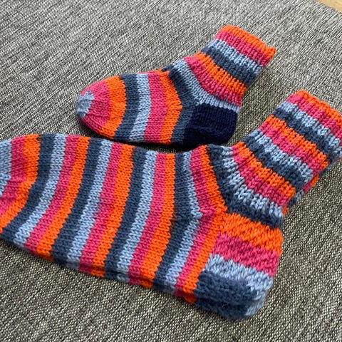 Neljä vyyhtiä villalankoja n. 400 g. Kirjava on Pirtin kehräämön 100% villaa. Punainen on sukkalankaa. Oranssi ja sininen ei varmaa tietoa, onko 100% villaa vai onko mukana jotain vahviketta.