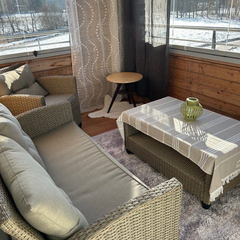 Ryhmään kuuluu suorakulmainen pöytä tummalla lasikannella, kaksi käsinojallista tuolia sekä kaksi jalkarahia. Tuoleissa ja raheissa on irrotettavat istuintyynyt. Polyrottinkirakenne soveltuu ulkokäyttöön, esimerkiksi parvekkeelle tai terassille. Pöydän lasikansi tarjoaa tasaisen pinnan ruokailuun tai oleskeluun, ja tuolit sekä rahit voidaan sijoittaa tilan mukaan kompaktisti parvekkeelle. Setti uudenveroinen, todella vähäisellä käytöllä nyt ylimääräiseksi jäänyt. Toimitus lisämaksusta mahdollista.