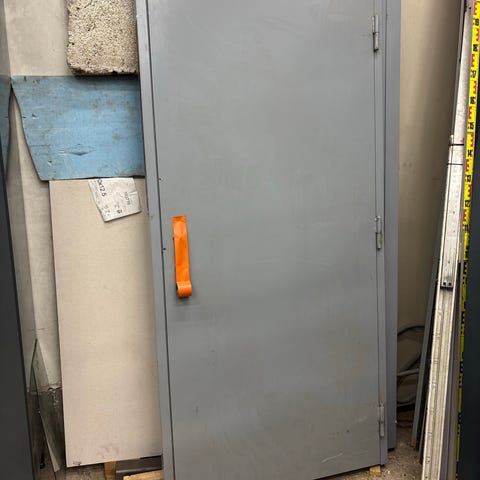 Valmet metalliovi karmeineen. Ovi on punainen ja valmistettu metallista. Karmit sisältyvät kokonaisuuteen. Mittojen perusteella oven leveys on noin 72cm ja korkeus noin 182 cm. Soveltuu esimerkiksi varasto- tai teknisen tilan oveksi. Mittakuvat antavat lisätietoa tarkemmista mitoista ja asennusaukon koosta.