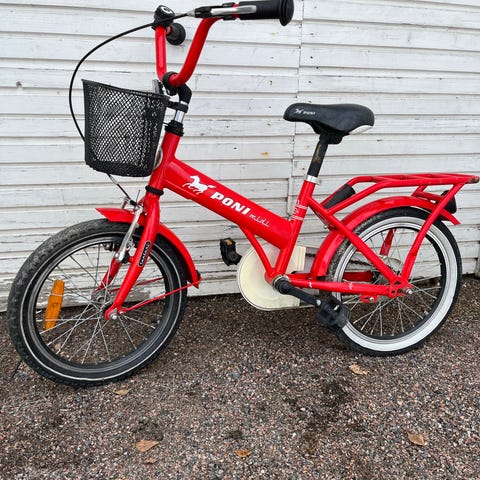 Tunturi lasten polkupyörä, 16" renkailla. Rungon väri pinkki ja lokasuojat sekä satula violetit. Pyörässä on etukori, tavarateline takana, täyskoteloinen ketjusuoja, käsijarru, soittokello ja seisontatuki. Pieniä käytön jälkiä. Mukaan apupyörät.