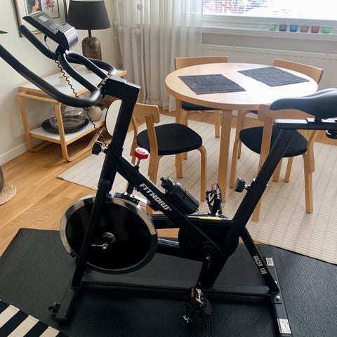 Musta Gymstick FTR spinningpyörä koti- tai kuntosaliharjoitteluun. Pyörässä on säädettävä satula ja ohjaustanko, jotka mahdollistavat ajoasennon muokkaamisen eri käyttäjille sopivaksi. Laitteessa on etupyörän yläpuolella näyttö, josta voi seurata perustoimintoja, kuten aikaa ja matkaa (tarkemmat toiminnot mallikohtaisia). Polkimissa on hihnat, jotka tukevat jalkaa polkiessa. Runko on teräksinen ja pyörä on suunniteltu sisäpyöräilyharjoitteluun ja kunnon ylläpitoon kotikäytössä.