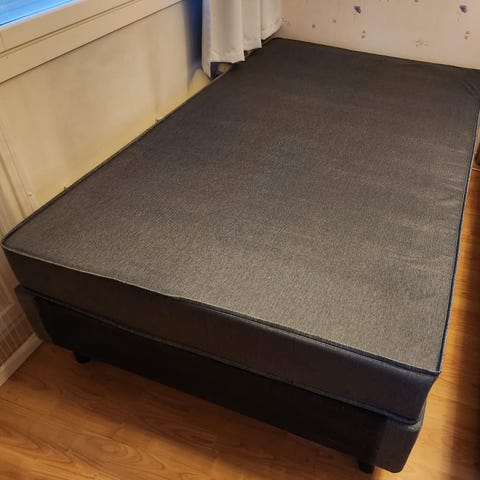 Lectus jenkkisänky sinisellä verhoilulla. Sängyssä on alarunko ja paksu joustinpatja samansävyisellä kankaalla. Sopii kahden hengen sängyksi makuuhuoneeseen tai mökille. Merkkikirjailu näkyy sängyn reunassa. Tarkka koko ei käy ilmi kuvista, mutta sänky vaikuttaa leveältä parivuoteelta. Siisti ja puhdas petauspatjassa muutama ratkeama. 160cm leveä.