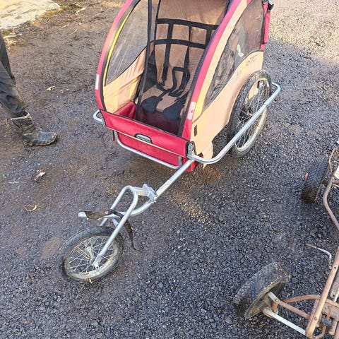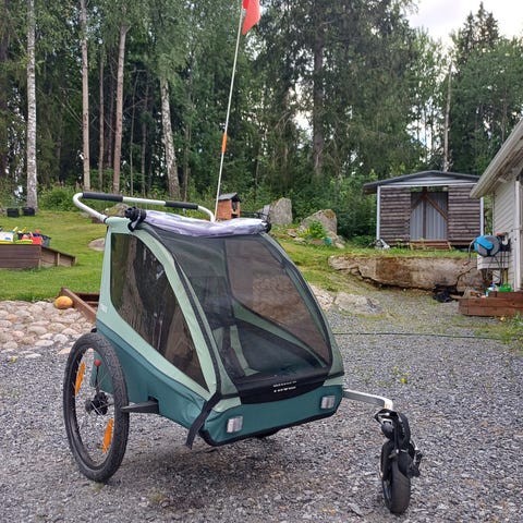 Thule Coaster XT kahden istuttava pyöräkärry, jota voi käyttää myös kävellen työntökärrynä.