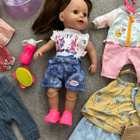 Baby Born nukke ja vaatesetti. Mukana on nukke sekä housuja, puseroita, haalari, hameita, pipoja ja vaippa. Hyvässä leikityssä kunnossa, nuken päässä hieman vaaleaa viirua. Hyvä setti seuraavalle leikkijälle!
