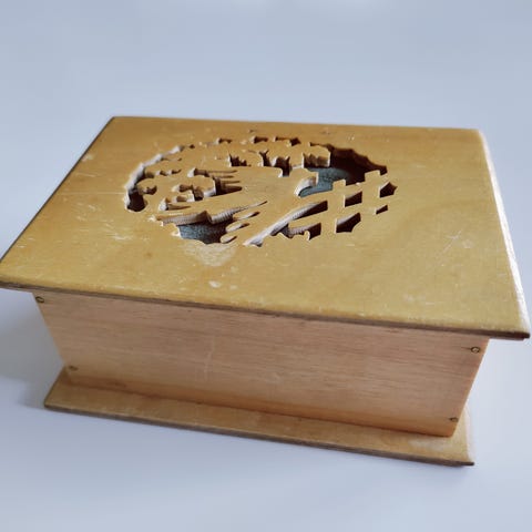 Taidokkaasti koristekuvioitu ja maalattu puinen säilytysrasia. Täyspuinen. Mitat 22cm x 12cm x 6cm. Nouto tai postitus.