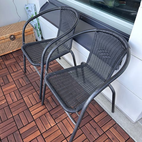 2kpl mustat JYSK:stä ostetut terassituolit / parveketuolit. Metallirunko ja muoviset istuinosat. Muuten erinomaisessa kunnossa kunnossa, mutta toisesta yhdestä kohdasta istuinosan "narut" katkenneet, ei haittaa käyttöä! Olleet reilu 2v käytössä lasitetulla parvekkeella.