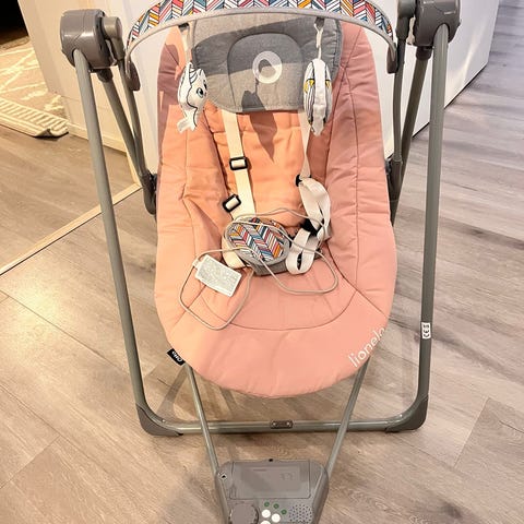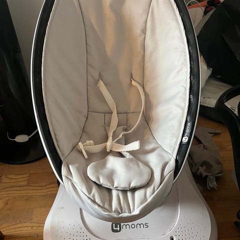 Emma sähköinen sitteri vauvalle. Sitterissä on pehmustettu istuinosa harmaalla kuviollisella kankaalla ja turvavaljaat lapsen kiinnittämistä varten. Jalustassa on ohjauspaneeli, jolla säädetään sitterin toimintoja. Saa myös musiikkia. Soveltuu vauvan lepäämiseen ja rauhoitteluun kotikäytössä valmistajan paino- ja ikäsuositusten mukaan. Nouto Munkkivuori