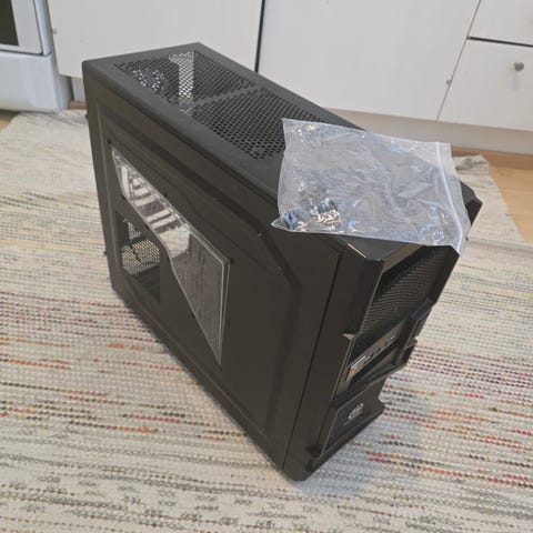 Kotelossa on musta ulkokuori ja läpinäkyvä lasinen sivupaneeli, joka mahdollistaa sisäosien näkyvyyden. Yläpaneelissa on tuuletusaukko pölysuodattimella. Etupaneelissa on useita liitäntöjä, kuten USB-portit ja ääni-liitännät. Soveltuu pöytätietokoneen kokoamiseen ja komponenttien päivittämiseen, kun tarvitaan ATX-yhteensopiva kotelo hyvällä ilmanvaihdolla ja läpinäkyvällä sivulla.