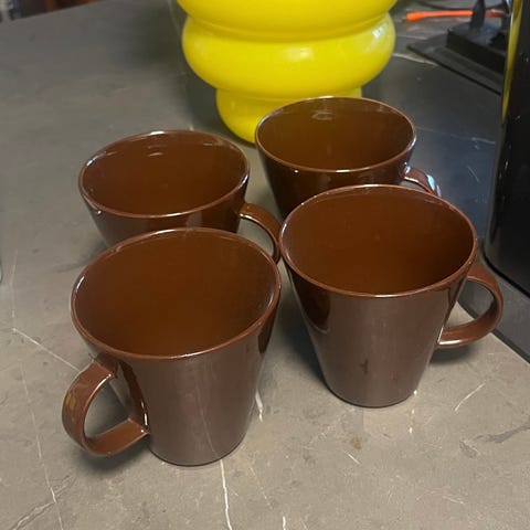 Arabia Koko mukit. Myydään useita eri värisiä mukeja, muun muassa vaaleansininen, vaaleanpunainen, tummanruskea ja kuviollinen versio.