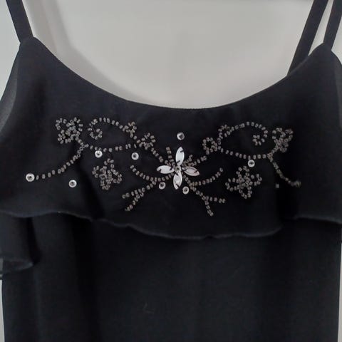 Vero Moda ilta- tai juhlapuku, koko 36. Musta naisten mekko, jossa V-pääntie edessä ja takana. Edessä laskoksia ja koristeelliset metalliset yksityiskohdat vyötärön kohdalla. Materiaali 100 % polyesteriä. Kai-kai noin 44 cm, olka-helma noin 95 cm. Savuton koti.
