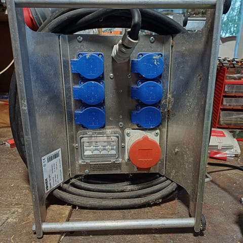 Mukana virtakaapeli, kuvassa koneen päällä oleva omatekoinen ilmasuutin, ja halutessaan saa myös mukaan tuon lastulevyn, jonka päällä laite on ollut.