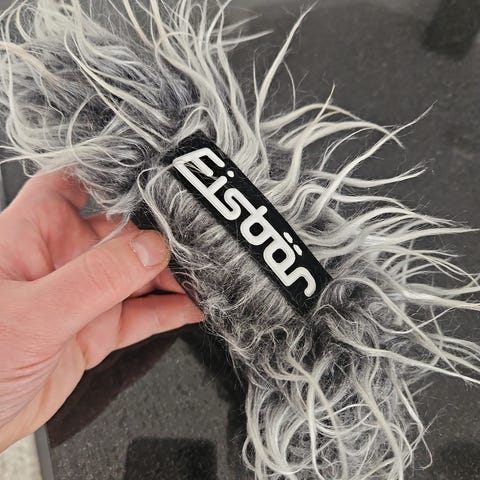 Musta Eisbärin lasten kypäränpäällinen, jossa valkoiset sarvet ja oranssi tekoturkiksinen harja. Aukot kypärän kiiinnitysremmeille ja takana laskettelulaseille. Sopii käytettäväksi esimerkiksi laskettelu- tai luistelukypärän päällä tuomaan näkyvyyttä ja iloa.
