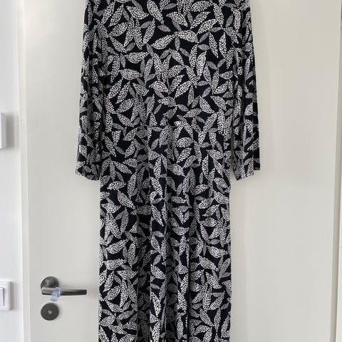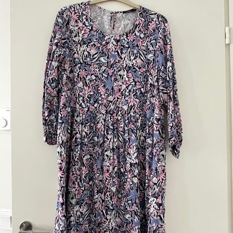 Kerran päällä ollut mekko nyt uudelle kantajalle. Mekko pesty kahdesti käsin ja silitetty käyttöä sekä kaappia varten. Mekko ei jousta, kai-kai 57cm, ja helman leveys ennen frillasaumaa 73cm. Olka-helma 110cm. Kaulus taittuu kauniisti.
