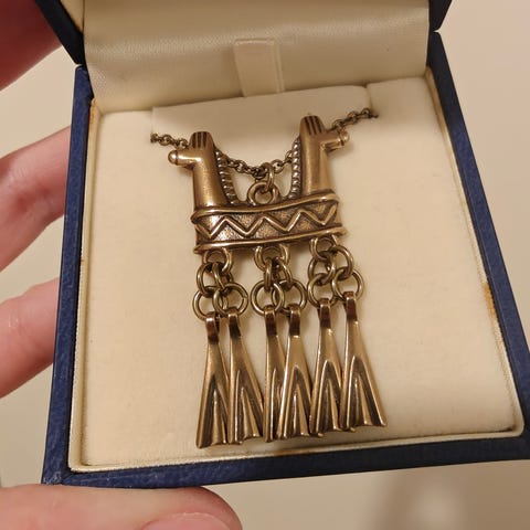 Kuvan mukainen harvoin käytössä ollut pronssinen kaulaketju. Ketjun pituus n. 60 cm. Tavanomaista ajan tuomaa patinaa.
